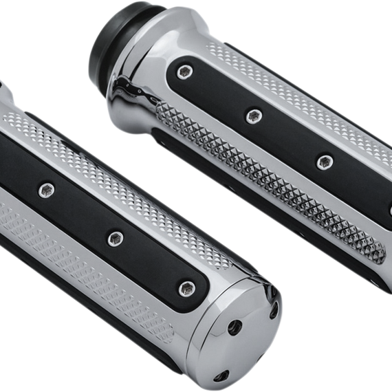 Caracteristicas: Grip housings are cast-aluminum construction Form-fitted premium EPDM rubber compound inserts for comfort, durability and longevity Knurled areas between the rubber pads provide added grip Matching aluminum end caps included