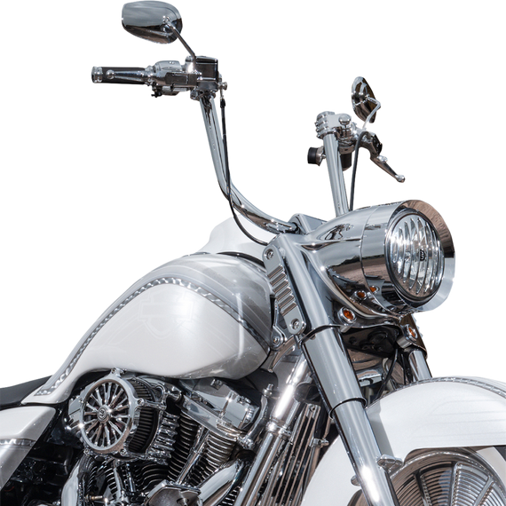 Caracteristicas: Innovative bars present the ultimate in rider personal adjustment and fit Unique "Klamps" allow control/grip portions of the handlebar to be adjusted in several directions; rider can tailor to his/her exact liking Bar sections are manufactured from DOM tubing, 'Klamps' are machined from 6061 billet aluminum, all hardware is stainless steel All feature a fully knurled riser clamp area for standard 5-1/4" width 1” risers All are drilled/slotted for wiring and bar end is notched for Throttle-By-Wire applications All include chromed, billet aluminum, domed bar end plugs for a finished look Works with HD OEM Heated Grips Made in the U.S.A.