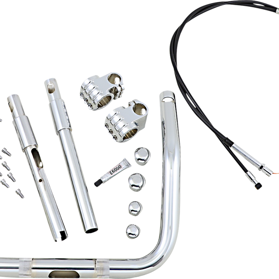 Caracteristicas: The ultimate in rider personal adjustment and fit Innovative "Klamps" allow the control/grip portions of the handlebar to be adjusted in several directions to allow the rider to find that perfect fit Include handlebars manufactured from DOM tubing, clamps machined from 6061 billet aluminum, chrome hardware, polished aluminum domed bar end plugs and black clutch cable Bars are drilled and slotted for internal wiring and work with heated grips Bar ends are slotted for throttle-by-wire option Fully knurled center section (riser clamp area) for use with stock riser clamp set-up Made in the U.S.A.