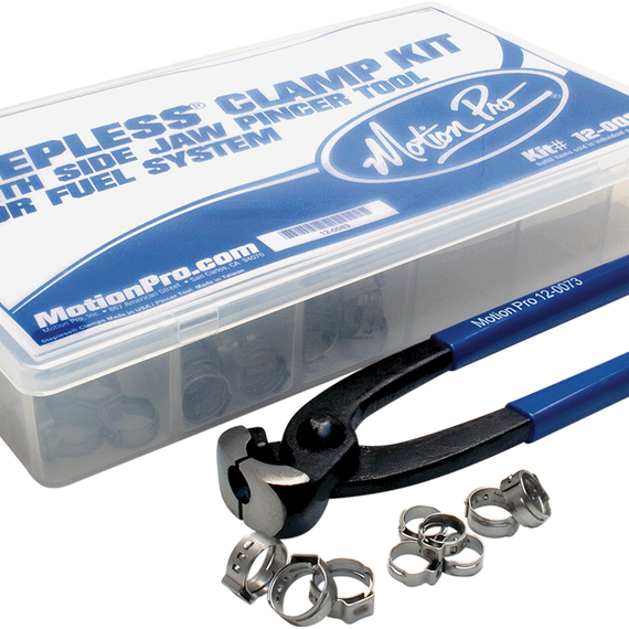 Caracteristicas: Convenient kit includes 80 pieces of hardware, a Motion Pro Side Jaw Pincer tool and a convenient fuel line clamp size chart Specially formed strip edges reduce the risk of damage to the part being clamped 360° Stepless® design with no gaps on inner surface
