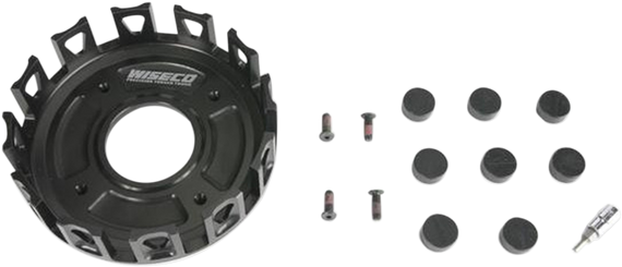 Caracteristicas: Forged from lightweight aerospace-grade aluminum alloy; CNC machining ensures each clutch basket is identical to the next Weight-saving relief cuts on outside of clutch reduce rotational mass, allowing engine to rev quicker Large oiling holes increase lubrication and reduce heat buildup PTFE coating makes for a near-frictionless surface Come with fasteners complete with pre-applied thread locker