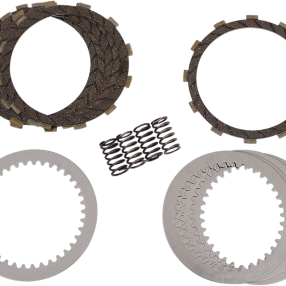 Caracteristicas: Anti-swell, alloy-impregnated heavy-duty cork-based facings for smooth clutch take-up Allow modulation, unlike paper clutches that tend to snatch Complete engine set of friction plates, HD springs and steel separator plates prevent premature driven plate wear, oil muddying and loss of stack height Built with swagged aluminum carriers that spread the load on the clutch basket and prevent clutch basket "dogging" 10-15% uprated heavy duty clutch springs