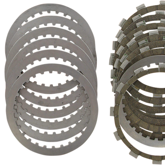 Caracteristicas: Get all the performance without all the fade or slip Get all the performance without all the fade or slip Friction plates are ready to fit - no need to pre-soak in oil Friction plates are ready to fit - no need to pre-soak in oil Designed to ensure ultra-smooth power delivery Designed to ensure ultra-smooth power delivery More durable than OEM clutch plates More durable than OEM clutch plates High-heat friction material for fade-free performance High-heat friction material for fade-free performance Clutch springs are shot-peened for maximum life, heat-treated and precision-wound using only the finest chrome silicon Clutch springs are shot-peened for maximum life, heat-treated and precision-wound using only the finest chrome silicon Springs are individually designed for each application to ensure easy operation and great feel at the lever Springs are individually designed for each application to ensure easy operation and great feel at the lever Kits available with or without steel friction plates Steel friction plates are precision-made using exacting tolerances Steel friction plates are precision-made using exacting tolerances Plates are heat-treated for maximum life Plates are heat-treated for maximum life Will not muddy or contaminate oil Will not muddy or contaminate oil Both styles of clutch kit include friction plates and springs (unless noted in part specific text)