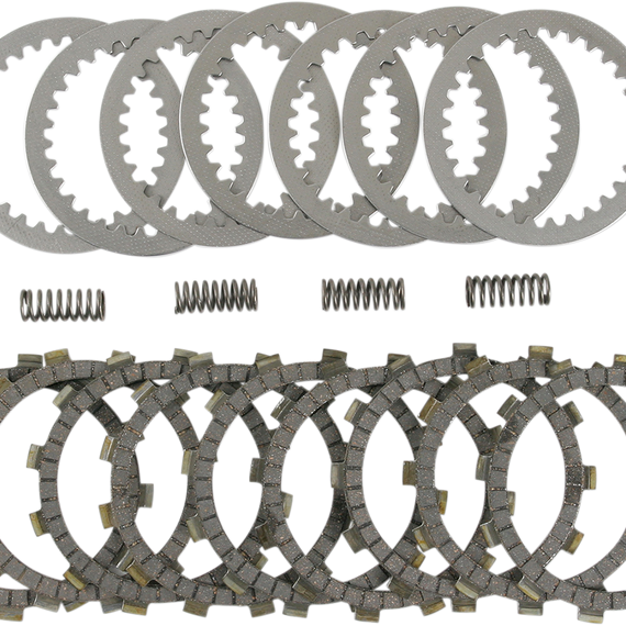 Caracteristicas: Anti-swell, alloy-impregnated heavy-duty cork-based facings for smooth clutch take-up Allow modulation, unlike paper clutches that tend to snatch Complete engine set of friction plates, HD springs and steel separator plates prevent premature driven plate wear, oil muddying and loss of stack height Built with swagged aluminum carriers that spread the load on the clutch basket and prevent clutch basket "dogging" 10-15% uprated heavy duty clutch springs Not for use with 100% synthetic oil