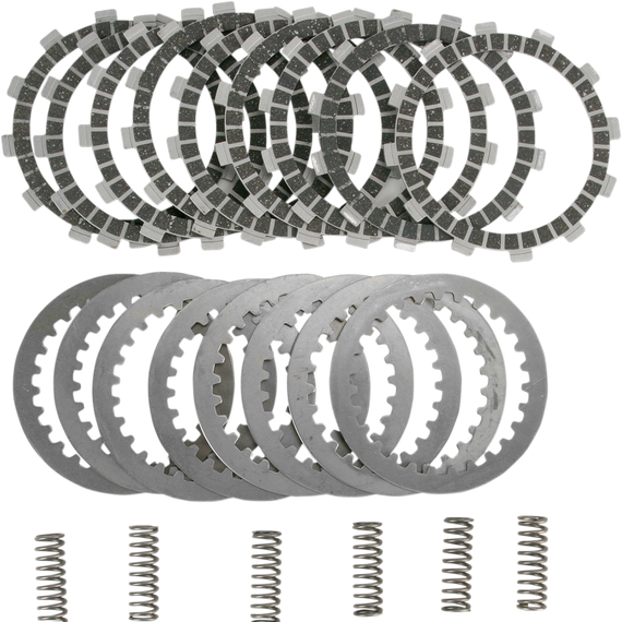 Caracteristicas: Get all the performance without all the fade or slip Get all the performance without all the fade or slip Friction plates are ready to fit - no need to pre-soak in oil Friction plates are ready to fit - no need to pre-soak in oil Designed to ensure ultra-smooth power delivery Designed to ensure ultra-smooth power delivery More durable than OEM clutch plates More durable than OEM clutch plates High-heat friction material for fade-free performance High-heat friction material for fade-free performance Clutch springs are shot-peened for maximum life, heat-treated and precision-wound using only the finest chrome silicon Clutch springs are shot-peened for maximum life, heat-treated and precision-wound using only the finest chrome silicon Springs are individually designed for each application to ensure easy operation and great feel at the lever Springs are individually designed for each application to ensure easy operation and great feel at the lever Kits available with or without steel friction plates Steel friction plates are precision-made using exacting tolerances Steel friction plates are precision-made using exacting tolerances Plates are heat-treated for maximum life Plates are heat-treated for maximum life Will not muddy or contaminate oil Will not muddy or contaminate oil Both styles of clutch kit include friction plates and springs (unless noted in part specific text)