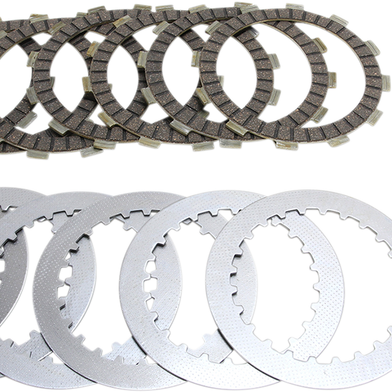 Caracteristicas: Anti-swell, alloy-impregnated heavy-duty cork-based facings for smooth clutch take-up Allow modulation, unlike paper clutches that tend to snatch Complete engine set of friction plates, HD springs and steel separator plates prevent premature driven plate wear, oil muddying and loss of stack height Built with swagged aluminum carriers that spread the load on the clutch basket and prevent clutch basket "dogging" 10-15% uprated heavy duty clutch springs Not for use with 100% synthetic oil