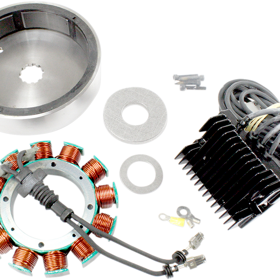 Caracteristicas: Kit includes stator, rotor and a black series-type regulator Series-type regulator reduces load on stator and decreases engine drag Not for fuel-injected models.