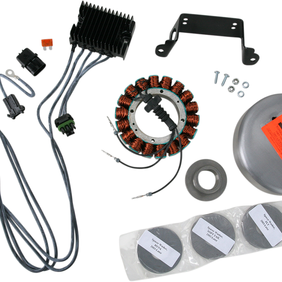 Caracteristicas: Provide 25A at idle and 40A continuously above 2800 rpm Unique narrow rotor and stator fit into Softail/Dyna/FLT primary cases as used by most custom builders and the voltage regulator bolts on the stock location without any frame modifications Custom-designed flanged seal spacer provides maximum support for the rotor Voltage regulator output is calibrated to 14.25V from idle on up Ideal for fuel-injected engines and bikes with overdrive-type transmissions Made in the U.S.A.