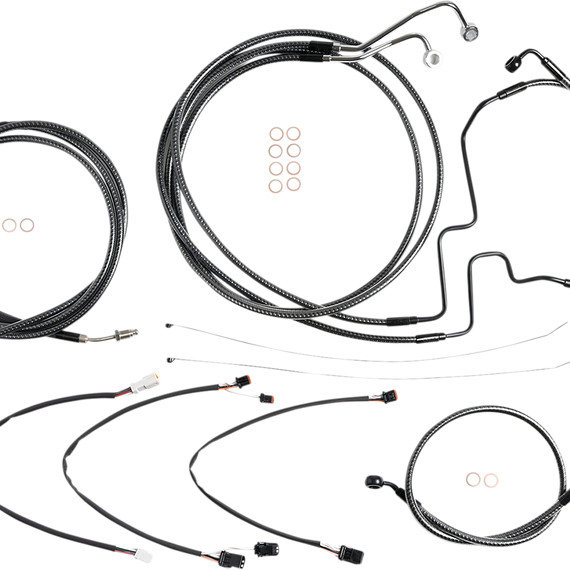 Caracteristicas: KARBONFIBR wire braid is created from distinct black and gray tone wire colors which are blended and interwoven together to mimic the look of hi-tech carbon fiber. This unique alternative black braid highly complements black or blackout color scheme motorcycles Kits include – Premium DOT brake lines, clutch cable or hydraulic clutch line, throttle and idle cables or throttle-by-wire extensions, hardware, and fully terminated or plug-and-play switch and turn signal extensions Matching KARBONFIBR braided hydraulic lines and control cables provide a precise, OE fit KARBONFIBR high-efficiency cables feature anti-friction liners and inserts, durable clear coating, are factory lubricated for smooth, long-lasting operation, plus they meet or exceed OE specifications Clutch cables include a water-proof adjuster and a transmission fitting seal to eliminate oil leaks Premium KARBONFIBR DOT brake lines incorporate PTFE tubing braided with DuPontTM Kevlar® Aramid Fiber reinforcement, Signature braid, and a clear PVC jacket Every Magnum brake line is pressure tested and fully FMVSS-106 compliant