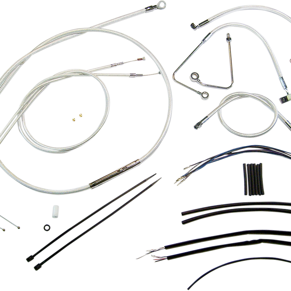 Caracteristicas: Complete kits with matching braided cables and brake lines Kits include throttle and idle cables of throttle-by-wire extensions, clutch cable or hydraulic clutch line, brake lines, copper crush washers, hardware, and any necessary switch wiring of turn signal extension All cable and brake lines feature Sterling Chromite II braid with highly polished chrome plated fittings All cables are a low-effort, high-efficiency design that meets or exceeds all OE specifications for fitment, construction and endurance Kits for dual disc models include an all brazed manifold that eliminates leaks, alignment problems and unattractive threaded connections Assembled in the U.S.A. Kits are based on using ape hanger style handlebars with 2” risers