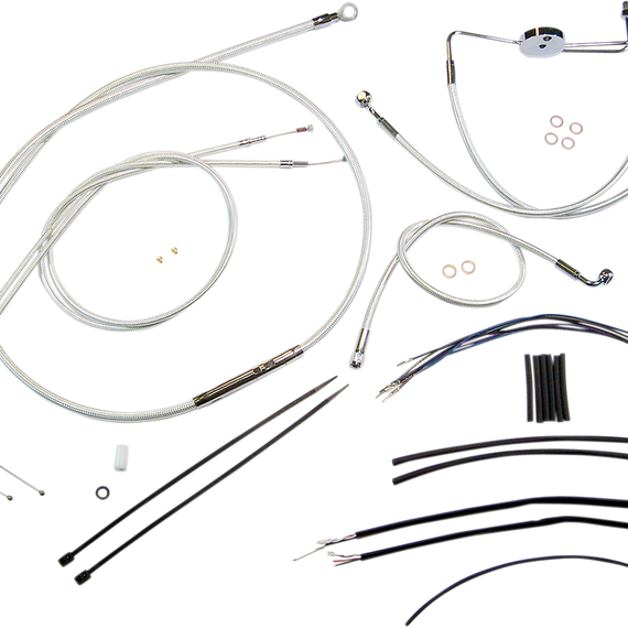 Caracteristicas: Complete kits with matching braided cables and brake lines Kits include throttle and idle cables of throttle-by-wire extensions, clutch cable or hydraulic clutch line, brake lines, copper crush washers, hardware, and any necessary switch wiring of turn signal extension All cable and brake lines feature Sterling Chromite II braid with highly polished chrome plated fittings All cables are a low-effort, high-efficiency design that meets or exceeds all OE specifications for fitment, construction and endurance Kits for dual disc models include an all brazed manifold that eliminates leaks, alignment problems and unattractive threaded connections Assembled in the U.S.A. Kits are based on using ape hanger style handlebars with 2” risers