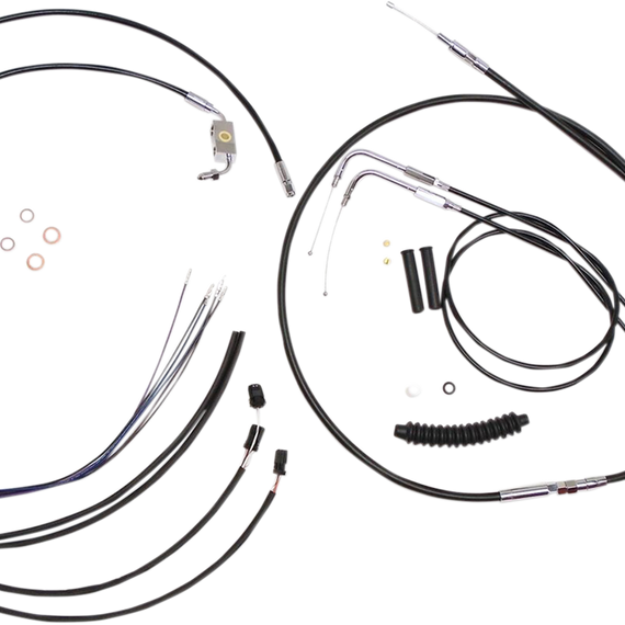 Caracteristicas: Magnum XR Handlebar Installation Kits offer a great fit and excellent quality at an economical price Kit features highly polished, chrome plated fittings All cables are a low effort, high efficiency design that meets or exceeds all OE specifications for fitment, construction, endurance Magnum XR Brake Lines use an enhanced construction of heavy gauge stainless steel embedded in tough abrasion resistant nylon outer jacket for superior durability and extreme braking response for safe riding The coating on cables and brake lines offers exceptional protection for paint or chrome Kits that include manifolds use an all brazed construction to ensure optimal OE fitment and appearance Manifolds use -3 AN connections for an easy installation Kits include throttle and idle cables or throttle-by-wire extensions, clutch cable or XR hydraulic clutch line, XR brake lines, copper crush washers, hardware, turn signal and switch wiring extensions Kits are based on using ape hanger style handlebars and 2" risers.