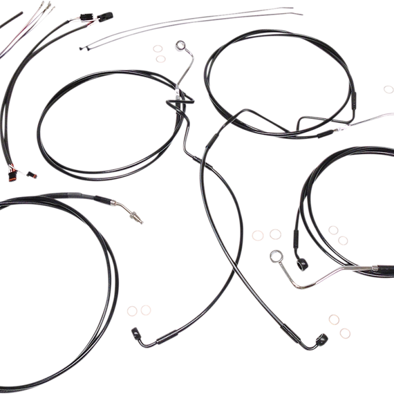 Caracteristicas: Magnum XR Handlebar Installation Kits offer a great fit and excellent quality at an economical price Kit features highly polished, chrome plated fittings All cables are a low effort, high efficiency design that meets or exceeds all OE specifications for fitment, construction, endurance Magnum XR Brake Lines use an enhanced construction of heavy gauge stainless steel embedded in tough abrasion resistant nylon outer jacket for superior durability and extreme braking response for safe riding The coating on cables and brake lines offers exceptional protection for paint or chrome Kits that include manifolds use an all brazed construction to ensure optimal OE fitment and appearance Manifolds use -3 AN connections for an easy installation Kits include throttle and idle cables or throttle-by-wire extensions, clutch cable or XR hydraulic clutch line, XR brake lines, copper crush washers, hardware, turn signal and switch wiring extensions Kits are based on using ape hanger style handlebars and 2" risers.
