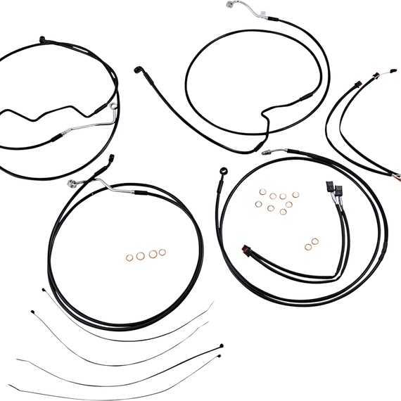 Caracteristicas: Magnum XR Handlebar Installation Kits offer a great fit and excellent quality at an economical price Kit features highly polished, chrome plated fittings All cables are a low effort, high efficiency design that meets or exceeds all OE specifications for fitment, construction, endurance Magnum XR Brake Lines use an enhanced construction of heavy gauge stainless steel embedded in tough abrasion resistant nylon outer jacket for superior durability and extreme braking response for safe riding The coating on cables and brake lines offers exceptional protection for paint or chrome Kits that include manifolds use an all brazed construction to ensure optimal OE fitment and appearance Manifolds use -3 AN connections for an easy installation Kits include throttle and idle cables or throttle-by-wire extensions, clutch cable or XR hydraulic clutch line, XR brake lines, copper crush washers, hardware, turn signal and switch wiring extensions Kits are based on using ape hanger style handlebars and 2" risers.