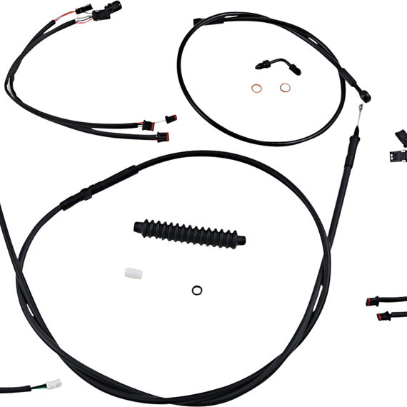 Caracteristicas: Magnum XR Handlebar Installation Kits offer a great fit and excellent quality at an economical price Kit features highly polished, chrome plated fittings All cables are a low effort, high efficiency design that meets or exceeds all OE specifications for fitment, construction, endurance Magnum XR Brake Lines use an enhanced construction of heavy gauge stainless steel embedded in tough abrasion resistant nylon outer jacket for superior durability and extreme braking response for safe riding The coating on cables and brake lines offers exceptional protection for paint or chrome Kits that include manifolds use an all brazed construction to ensure optimal OE fitment and appearance Manifolds use -3 AN connections for an easy installation Kits include throttle and idle cables or throttle-by-wire extensions, clutch cable or XR hydraulic clutch line, XR brake lines, copper crush washers, hardware, turn signal and switch wiring extensions Kits are based on using ape hanger style handlebars and 2" risers.