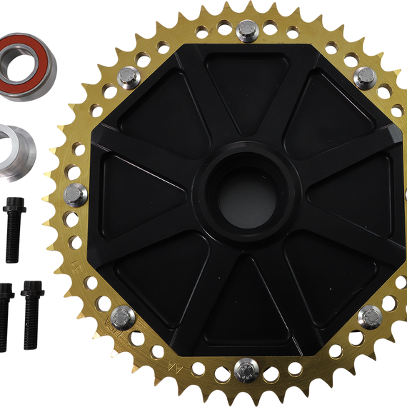 Caracteristicas: CNC-machined billet aluminum carrier and hub adapter CNC-machined sprocket made of 1026 medium- to high-carbon steel Fits stock or aftermarket wheel Made in the U.S.A.
