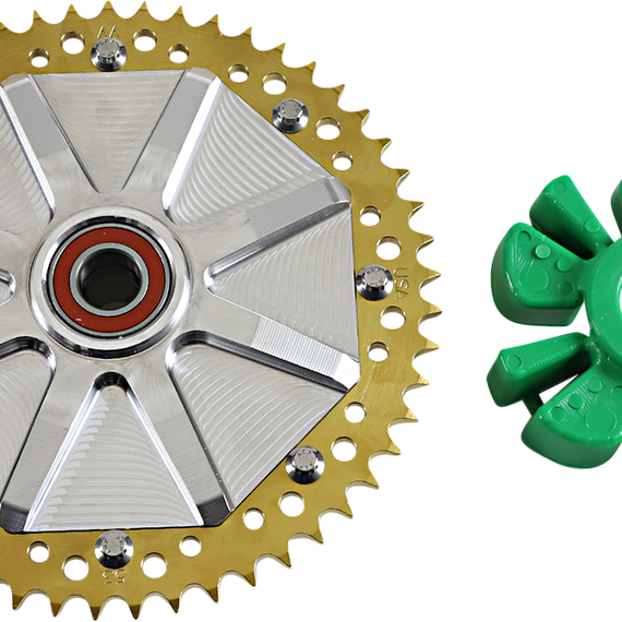 Caracteristicas: CNC-machined aluminum carrier 1026 medium-to-high carbon steel CNC-machined sprocket Includes stainless steel lock spring, two bearing and bearing spacer Use with a .750" offset front sprocket (sold separately) Made in the U.S.A.