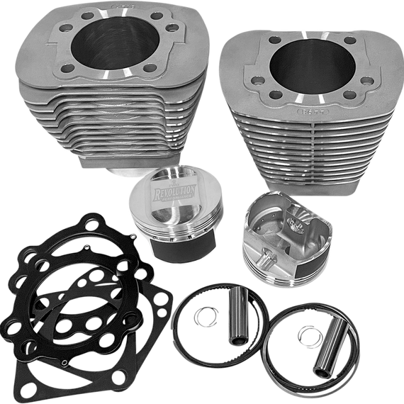 Caracteristicas: Revolution™ aerospace-grade all-aluminum cylinders with nickel-silicon-carbide electroplated bores, which means NO SLEEVING; allows larger bore sizes and less friction for more horsepower, lower temps, and a longer lifespan True bolt-on kit that delivers major power with no machine work required Also includes Wiseco forged pistons with rings (that are specifically designed for optimal compatibility with Revolution Performance's cylinders), wrist pins, circlips and high-performance head and base gaskets Replacement head and base gasket sets available separately Made in the U.S.A. For replacement pistons and rings, see Revolution Performance Big Bore Piston Kits.
