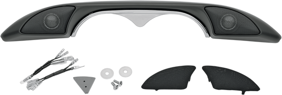 Caracteristicas: Complete add-on tweeter kit Doubles as a fairing accent piece with decorative chrome trim (included) Disassembles easily to paint-match custom-painted fairings Black "see through" grilles can also be painted or chromed Second set of cloth covered grilles included Works with all Hogtunes speaker systems, 98-13 stock systems or bikes with aftermarket car radios Includes custom-designed 50 watt (RMS) high-efficiency metalized dome tweeters with 3rd order (18 dB) passive crossovers Radically improves clarity and performance of your audio system All mounting hardware, drilling template and plug-and-play wiring is included in box