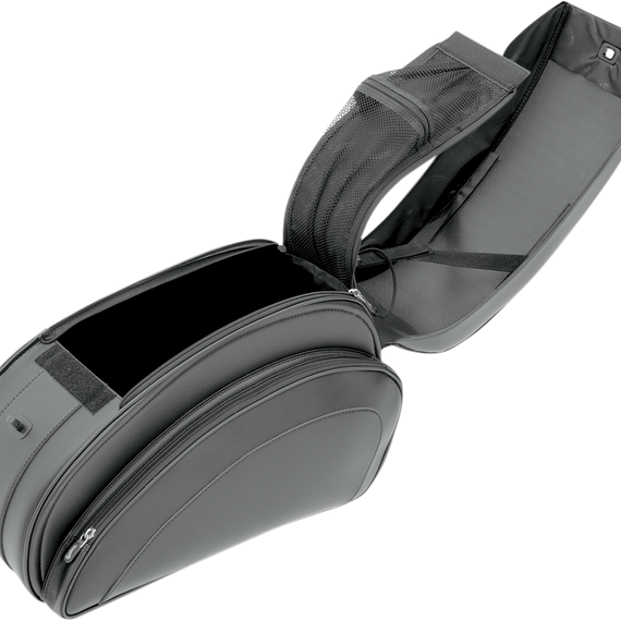 Caracteristicas: Distinctively styled saddlebags look great on any style motorcycle, with a layered lid and spacious zippered side pouches that flow together to create truly handsome luggage Rugged SaddleHyde™ construction bags with strong internal reinforcement to hold their shape, with lids that pivot forward when opening to provide excellent cargo access Contents stay clean and dry with zippered openings covered by weather flaps fitted with 1/4-turn hasps that accept mini padlocks for security Detachable and fully adjustable yoke system allows easy installation and combines perfectly with Saddlemen's saddlebag supports You can add a Saddlemen quick-release kit with supports to change from a throw-over saddlebag set to a rigidly mounted set that can be removed from your bike in seconds Throw-Over style fits most motorcycles Also available with a pair of chrome universal saddlebag supports Measure: 20-1/4" L x 9" W x 12-3/4" H