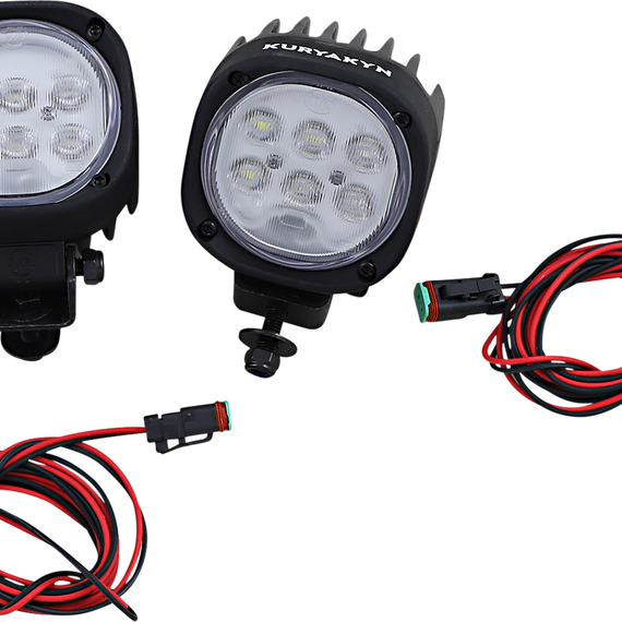 Caracteristicas: Durable polycarbonate lenses and aluminum housings with large cooling fins to dissipate heat Integrated over-heating, over-voltage and polarity protection 90mm x 90mm lamps (lens dimensions) put out a true/effective 1,850 lumens per light, with crisp 5700K color temp Universal compatibility with standard 12v electrical systems (each lamp draws 2.3 Amps) Kit includes two lamps with sealed connectors and wiring pigtails, and integrated mount brackets with fasteners IP69K rated for total dust ingress and high-pressure washing and/or steam cleaning Not DOT compliant
