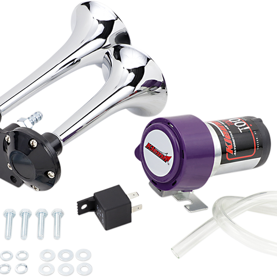 Caracteristicas: Dual air horns, 8.5" and 6.5" trumpets Compact kit, installed in virtually any vehicle Relay and tubing included 12-volt direct drive compressor included 132 db output