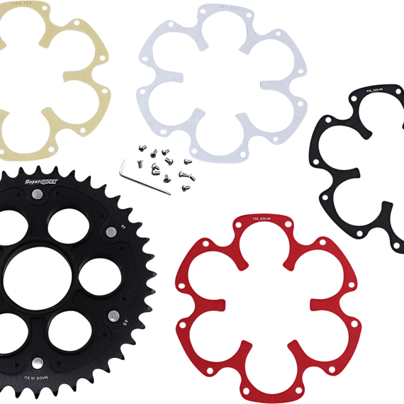 Caracteristicas: Perfect for long life, with added style Unique tooth design increases sprocket life up to 6% compared to similar designs Steel teeth for longer system life; aluminum core for reduced rotational mass - 30% lighter than the OEM part Includes interchangeable black, red, gold, silver inserts