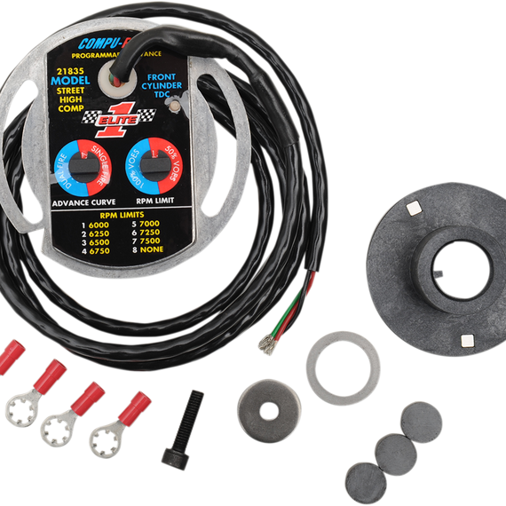 Caracteristicas: All electronics mounted in the nose cone (timing cover) Feature selectable advance curves (eight advance curves in either dual- or single-fire operation) Adjustable rpm limiter (eight rpm limits) Dual-range VOES operation Accu-Ray light for easy installation and check system Made in the U.S.A. Not for fuel-injected models