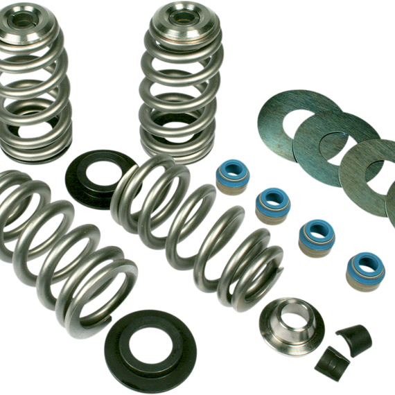 Caracteristicas: FEULING® BEEHIVE® valve springs use a much smaller and lighter weight retainer which drastically reduces the valve weight creating a much quicker revving and smoother motion than comparable dual valve springs FEULING® endurance springs are a direct bolt-in replacement up to 650 cam lift no machining or rocker box clearancing required Eliminate valve spring separation, maximize stability, reduce valve-train noise & harmonics FEULING® BEEHIVE® valve springs must be installed at the correct open height, matching max lift to the open height spec of the valve springs Kit include: FEULING® ENDURACE BEEHIVE® valve springs, lightweight 7° Titanium heat treated retainers, machined spring seats, seat shims, valve locks and a set of premium Viton® valve seals equipped with a spring loaded valve stem wiper system