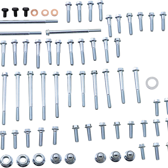 Caracteristicas: 4-Stroke kits fasten the crankcase, inner and outer clutch covers, water pump, left case cover, case saver, oil filter cover, cam tensioner, and starter 2-Stroke kits fasten the crankcase, inner and outer clutch covers, water pump, left case cover, case saver, reeds, cylinder, head, and power valve covers Includes all exterior fasteners for 2-stroke and 4-stroke engines Comes in easy-to-use, divided and labeled box