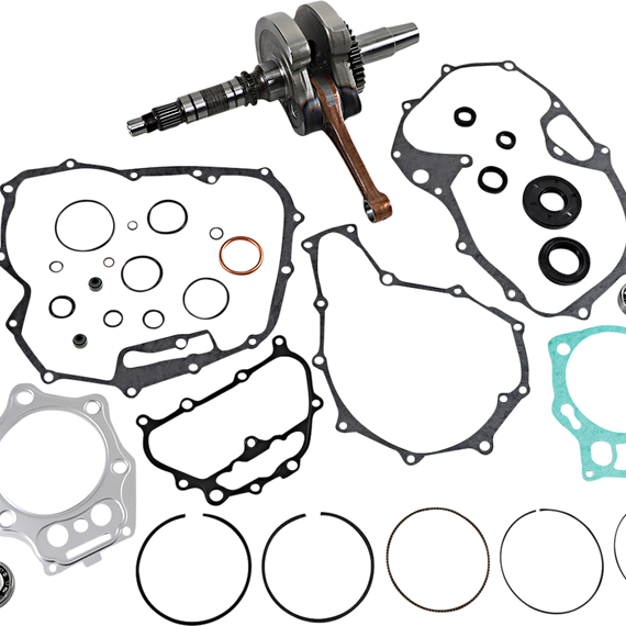 • Includes crankshaft, piston kit, complete engine gasket kit with oil seals, main bearings and seals, water pump rebuild kit, transmission bearings, countershaft bushing/seal kit, wrist pin bearing, cam chain and counter balancer bearings when applicable