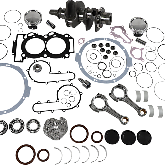 • Includes crankshaft, piston kit, complete engine gasket kit with oil seals, main bearings and seals, water pump rebuild kit, transmission bearings, countershaft bushing/seal kit, wrist pin bearing, cam chain and counter balancer bearings when applicable