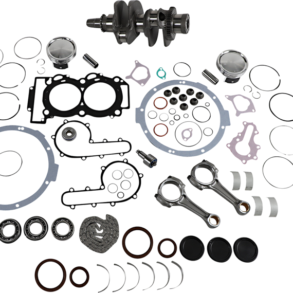 Caracteristicas: Complete engine rebuild kit Includes crankshaft, piston kit, complete engine gasket kit with oil seals, main bearings and seals, water pump rebuild kit, transmission bearings, countershaft bushing/seal kit, wrist pin bearing, cam chain and counter balancer bearings when applicable