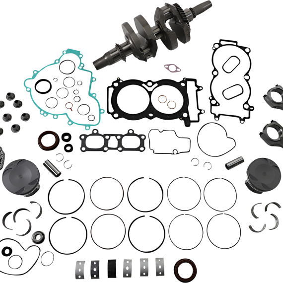 Caracteristicas: Complete engine rebuild kit Includes crankshaft, piston kit, complete engine gasket kit with oil seals, main bearings and seals, water pump rebuild kit, transmission bearings, countershaft bushing/seal kit, wrist pin bearing, cam chain and counter balancer bearings when applicable