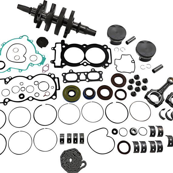 Caracteristicas: Complete engine rebuild kit Includes crankshaft, piston kit, complete engine gasket kit with oil seals, main bearings and seals, water pump rebuild kit, transmission bearings, countershaft bushing/seal kit, wrist pin bearing, cam chain and counter balancer bearings when applicable