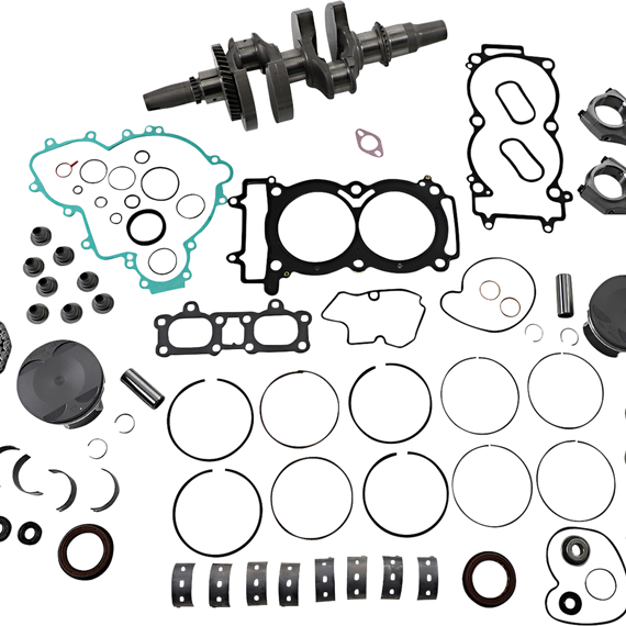 • Includes crankshaft, piston kit, complete engine gasket kit with oil seals, main bearings and seals, water pump rebuild kit, transmission bearings, countershaft bushing/seal kit, wrist pin bearing, cam chain and counter balancer bearings when applicable