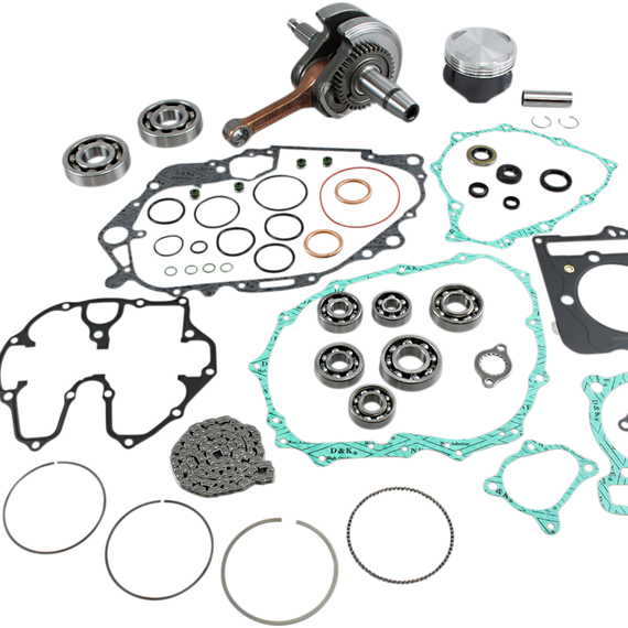 Caracteristicas: Convenient one-stop shop in a box; nearly all components required for a complete and professional rebuild Vertex piston kit (standard compression piston, rings, pin and clips) Hot Rods heavy-duty crank (stock stroke Æ’?? includes wrist pin bearing for two strokes) Hot Rods main bearing/seal kit Hot Rods transmission bearing kit (includes transmission bearings, output shaft collar and sprocket lock washer) Hot Rods counter balancer bearing kit Hot Rods water pump bearing and seal kit Vertex complete gaskets kit, including seals and O-ring kit (covers top and bottom)