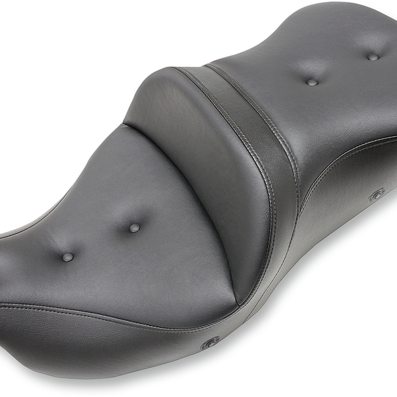 Caracteristicas: Refined split-cushion design separates the seating surface from the lumbar support to reduce tailbone/back pressure for maximum long-range comfort Extends the driver's seating area by a full 2" Seat features a combination of progressive density foam and SaddleGel inserts for superior driver and passenger comfort Pillowed soft upholstery cover backed by a compliant foam layer under the cover to provide incredible comfort and style Classic styled button-tufted cover Made in the U.S.A.