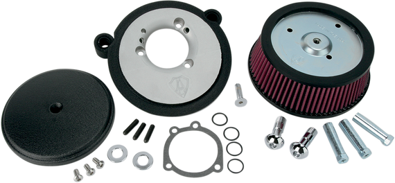 Caracteristicas: Features a one-piece aluminum backing plate/carb support bracket with patented hidden breather technology and radius air inlet Breather passages exit at the mouth of the carburetor/throttle body, creating a virtually closed-loop system Kit includes high-performance filter, backing plate and steel outer cover All necessary hardware and instructions are included with each kit