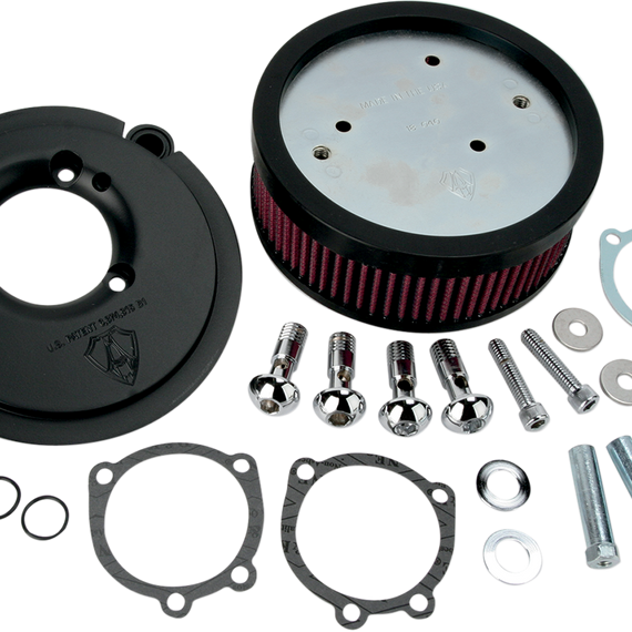 Caracteristicas: Each hidden breather is o-ringed at the heads and exits at the mouth of the injector/carb to provide efficient engine breathing, eliminating the need for any external hoses or hardware Standard red filters are pre-oiled, washable and feature four-layers of surgical grade cotton for optimum filtration and maximum airflow Synthetic filters feature a black synthetic material that is water resistant and never needs to be oiled; just wash and re-use Radius air inlet provides maximum performance by providing unobstructed airflow One-piece aluminum backing plate features patented hidden breather technology All necessary hardware and instructions are included with each kit