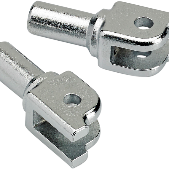 Caracteristicas: Constructed of investment-cast 4130 chromoly steel for strength Feature a threaded interface to make adjusting the angle of foot pegs easy The conical surface of the clevis creates a tension fit inside the foot peg when the cap screw us tightened inside the clevis, holding the peg in place. Fasten to the mount with the stock pivot pin assembly, or you can use 3/8' bolts and nuts to secure the complete peg assembly to your machine