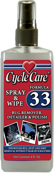 • Cycle Care® Formula 33 for Windshields, Paint & Chrome, a hyper-wetting spray, to clean and polish all surfaces