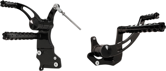 Caracteristicas: CNC-machined from 6061 T-6 aluminum 3/4" mounting plates for superior strength Feature sealed bearings on the pivot points for smooth operation and no maintenance Assembled with chrome hardware, kit comes ready to install Used with existing stock master cylinder Includes foot and toe pegs, mounting hardware and instructions Made in the U.S.A. When installing extended forward controls, check fender clearance before operating.