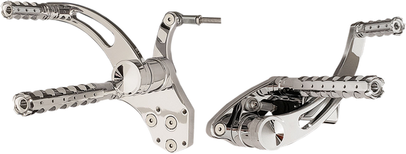 Caracteristicas: CNC-machined from 6061 T-6 aluminum 3/4" mounting plates for superior strength Feature sealed bearings on the pivot points for smooth operation and no maintenance Assembled with chrome hardware, kit comes ready to install Used with existing stock master cylinder Includes foot and toe pegs, mounting hardware and instructions Made in the U.S.A. When installing extended forward controls, check fender clearance before operating.