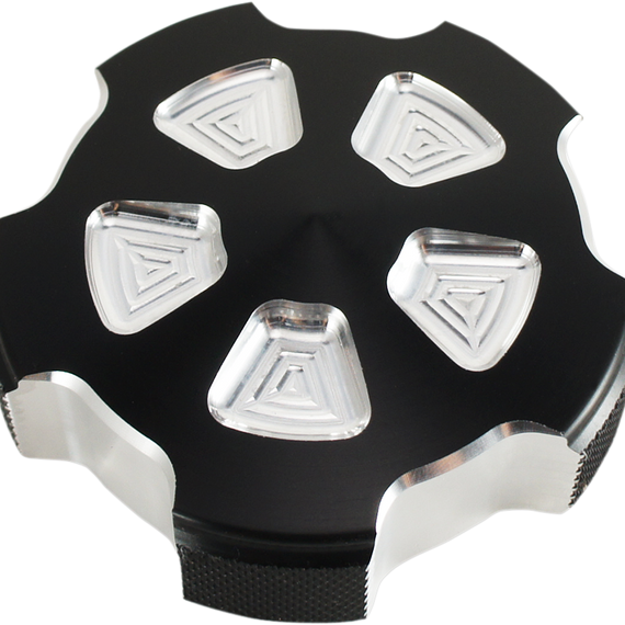 Caracteristicas: Unique "knurled & cut-out" profile design enables superior install and removal ease CNC-machined billet aluminum construction with anodized plating Special fuel resistant gasket seal included. Made in the U.S.A.