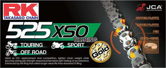 Caracteristicas: Pro X-ring chain lasts five to eight times longer than standard chain Provides two more lubricant pools than conventional O-rings for longer life Lubricated with specially formulated, vacuum-injected U-grease; locked in by tough Nitrile Butadine rubber X-rings Polished and shot-peened link plates High tensile strength ensures reliable performance
