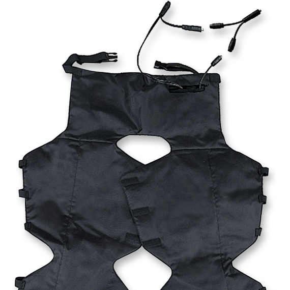 Caracteristicas: Uses a lightweight and wind-blocking fabric for maximum comfort and a form-fitted feel Thermal insulation Wear it over a thermal and under your riding gear for maximum warmth Elastic/hook-and-loop strap retention Designed to fit comfortably under regular riding pants Heated zones cover the full front, side of the leg, and lower stomach Built-in coax connectors at bottom of legs for easy connection of Gen X-4 Heated Socks (Heated Socks not included) Provides 46W of heat and draw 3.4A Plugs directly into GEN X-3 heated jacket liner or vest; for independent use with temperature control, purchase coax plug battery cord (PART #2130-0072) and single output temperature controller (PART #2130-0070), sold separately Integrated sock warmer plug come stowed in its own zippered pockets when not in use Works with a 12V battery providing 46 Watts of heat and draw 3.4 amps of current Size is measurement in inches from inseam to anklebone; should be slightly shorter than pants size. Always wear the leg chaps over a thermal garment or pants; use of temperature controller is highly recommended