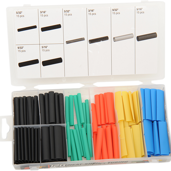 Caracteristicas: 120 assorted sizes and colors of heat shrink tubing in divided container Includes five colors of 5/32", 3/16", 9/32" and 5/16" diameter heat shrink 100% polyolefin construction and UL listed Rated for continuous use with temperatures between -60°-275°F