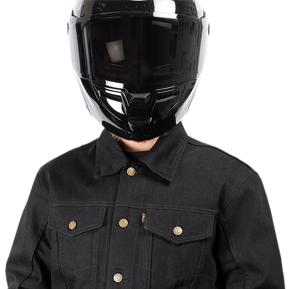 Caracteristicas: 12 oz Black Denim Dupont Kevlarâ„¢ lining on impact areas such as the back and arms Collar snaps keep collar down while at high speeds Adjustable sleeve cuffs & waist fitting buttons Pre-curved sleeves for comfortable riding position Direct embroider on back