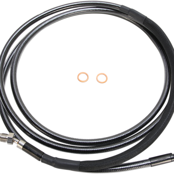 Caracteristicas: Constructed with PTFE inner tubing, DuPont Kevlar aramid fiber, premium Signature Magnum braids and an outer PVC jacket Three unique stainless steel transmission fittings eliminate the use of adapters Braid color and weave match all other Magnum control cables and brake lines Crystal clear outer jacket offers exceptional protection against scuffing the bike's paint or chrome and will never discolor Inner PTFE tubing braided with aramid fiber provides the ultimate in high performance and is compatible with all hydraulic fluids Transmission fittings for all hydraulic clutch lines have a natural stainless steel finish Compliant with all DOT FMVSS-106 Specifications Assembled in the U.S.A. 99-12 OE Harley, CVO, P&A and 02-17 V-Rod hydraulic clutch line fittings require taking a measurement to determine ordering length